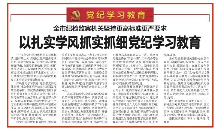 开展党纪学习教育,是加强党的纪律建设、推动全面从严治党向纵深发展的重要举措。市纪委监委制订《关于在市纪委监委机关全体党员中开展党纪学习教育的实施方案》,从“持续深入学习、坚持以案促学、加强宣传培训”3个方面细化8项具体措施,明确26项重点任务,坚持更高标准、更严要求,以扎实学风抓实抓细党纪学习教育。