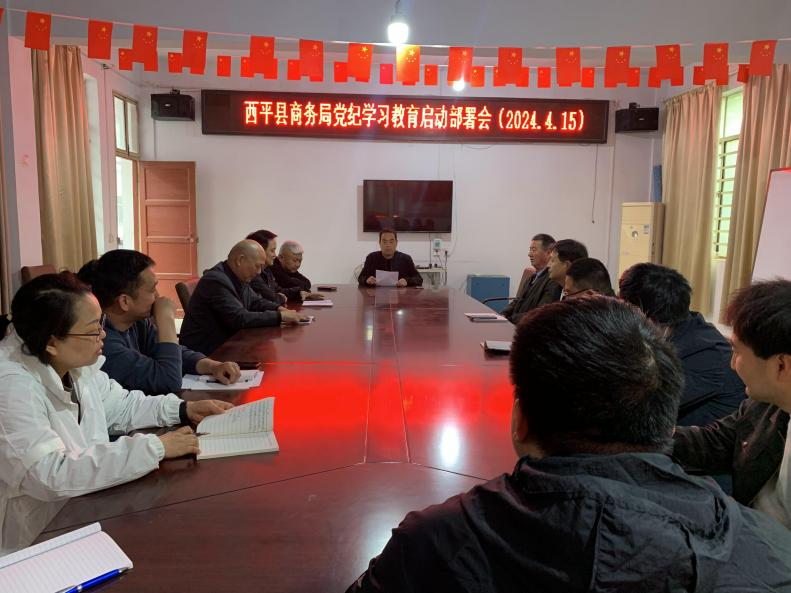 4月15日,西平县商务局召开党纪学习教育动员部署会议,传达学习习近平总书记关于党纪学习教育的重要讲话和重要指示精神,对全局开展党纪学习教育工作进行安排部署。县商务局党组成员、副局长田科明主持会议,在家领导班子成员、全体干部职工参加会议。
