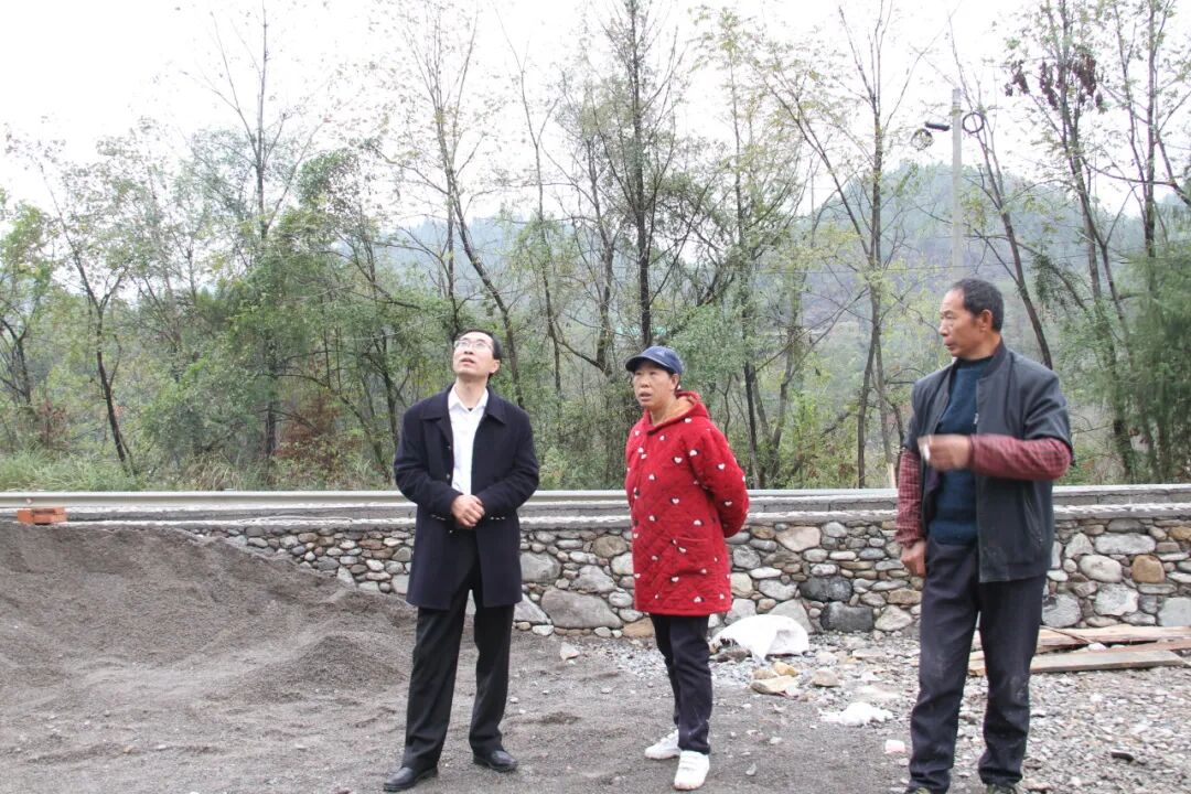 ▲刘俊(左一)了解村民灾后重建情况。(资料图片)