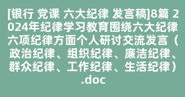 【经验借鉴】如何写一篇高质量的[银行 党课 六大纪律 发言稿]8篇 2024年纪律学习教育围绕六大纪律六项纪律方面个人研讨交流发言(政治纪律、组织纪律、廉洁纪律、群众纪律、工作纪律、生活纪律).doc?