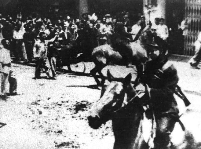 从国民党当局方面来说,狠心早已下定,动手的时间已到。下午三时多,吴国桢站在一个木箱上宣布:不允许进市区示威,不许前进。接着,马队突然向密集在路上的队伍冲过来,骑警们挥舞马刀乱砍。我认识的同学有被马刀砍伤的,有被马踢伤的,受伤的有100多人。我熟识的政治系二年级同学张渝民(复旦地下党总支委员、解放后曾任中共福建省委常委、秘书长)被马蹄踏伤,送入医院治疗。同学们从其美路向同济大学后退,有些同学跌倒在路旁的水沟里。吴国桢在混乱中也跌倒了。我熟识的土木系同学朱承中(地下党员)把他拉起来,并且阻止愤怒的同学打他。
