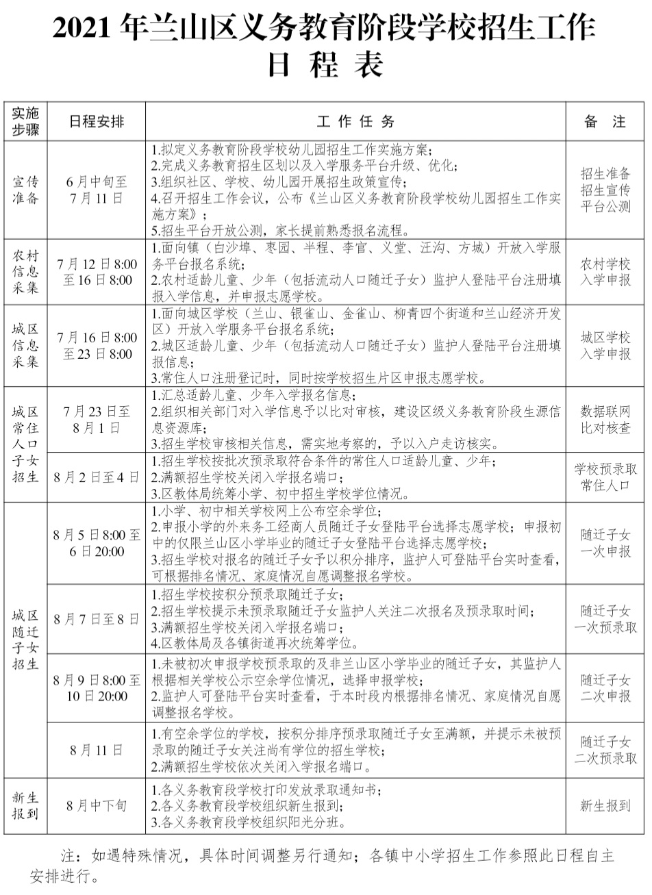 3、兰山城区随迁子女“一次申报”:8月5日8:00-8月6日20:00,外来务工经商人员随迁子女登陆入学服务平台申报志愿学校。“一次申报”城区初中学校的外来务工经商人员随迁子女仅限兰山城区小学毕业生。