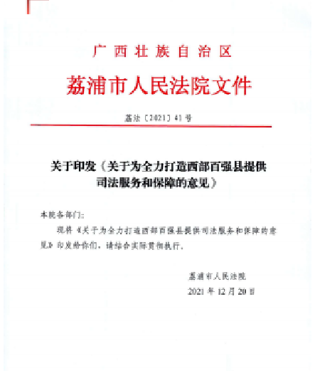 全年共编撰、审核、印发各类文件95个,起草领导讲话发言材料15份,各类汇报、调研、总结以及经验材料等26份,精心起草的《关于为全力打造西部百强县提供司法服务和保障的意见》(荔法〔2021〕41号)获得桂林中院杨晓春院长和荔浦市委李玉清书记的充分肯定,并作出了重要批示。