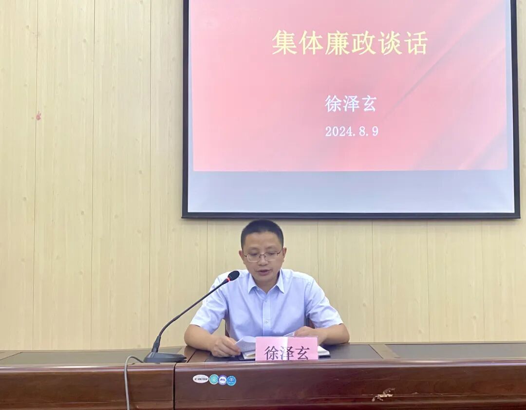 为深入贯彻落实全面从严治党要求,进一步强化党员干部廉洁自律意识和拒腐防变能力,8月9日,省卫生健康监测评价中心开展集体廉政谈话,中心党总支委员、副主任徐泽玄主持会议并讲话,关键岗位、新任职岗位等相关人员参加会议。