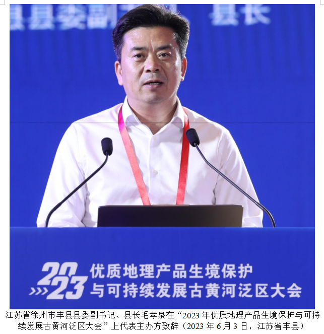 尊敬的龚主席、何院士、张理事长、钟市长、王巡视员,各位领导、各位专家,女士们、先生们、朋友们:大家下午好!非常高兴在这草木葱茏、麦香四溢的丰收时节,与各位新老朋友相聚在美丽的飞龙湖畔,共同出席2023年优质地理产品生境保护与可持续发展古黄河泛区大会。在此,我谨代表中共丰县县委、丰县人民政府,向莅临大会的各位嘉宾,表示热烈的欢迎!向长期以来关心和支持丰县经济社会发展的各界人士,表示衷心的感谢!借此机会,我向大家简要汇报一下丰县情况。丰县位于江苏省西北部,苏鲁豫皖四省七县接壤处,淮海经济区中心地带,总面积1450平方公里,总人口121万人,下辖1个省级经济开发区、12个镇和3个街道。丰县历史文化底蕴厚重。有着五千多年的文明史和两千多年的建城史,是汉高祖刘邦和道教始祖张道陵的诞育地,名相萧何、杂家刘安、清代三朝重臣李卫等均出生于此,两汉文化一脉相承,源远流长。丰县生态环境秀美动人。先后被评为“国家级生态示范县”、“全国平原绿化先进县”,森林覆盖率多年来稳居全省县级首位,境内大沙河是全省唯一一条建成的全国示范河湖,大沙河国家湿地公园百鸟齐鸣、碧水映蓝天。丰县发展态势蓬勃向上。近年来,丰县紧扣“聚力产业强县”目标定位,锚定农产品加工、新能源车辆等五大特色主导产业,全力打造齐头并进、互为支撑的发展格局。特别是在农业发展和食品及农副产品加工产业方面,作为传统农业大县,20世纪90年代,全国农业产业现场会就曾在丰县召开,农业产业结构调整在全省最早。我县重点聚焦“果菌菜牧”四大特色产业,不断做大产业集群,拥有君乐宝乳业、林家铺子、大红德邻等重点龙头企业25家;拥有1家省级农业高新技术产业示范园,园区落户了同福集团、二十二城等一批知名农业龙头企业,构建起了“从田园到餐桌”的绿色食品产业链。同时,我县还先后获得了“全国县域数字农业农村发展先进县”、“全国首批数字乡村试点县”、“全国电子商务进农村综合示范县”、“互联网+农产品出村进城工程试点县”等称号。丰县自然资源丰饶富足。拥有“果、菌、菜、牧”等四大地上资源和“盐、煤、钾、地热”等四大地下资源。丰县土层深厚、质地疏松,十分有利于牛蒡等根茎类农作物和苹果、梨等果树的生长,是享誉中外的“红富士苹果之乡”、“牛蒡之乡”、“薹蒜之乡”、“毛木耳之乡”,也是牛蒡标准化生产和深加工基地。中科院地理科学与资源研究所是国家地理科学、资源科学和地球信息科学的重要创新基地。早在2021年,丰县就与贵所在优质地理产品生境认证与推广、全域旅游等多个领域,开展了深层次战略合作,取得了一系列丰硕成果。当前,丰县正按照徐州市建设国家可持续发展议程创新示范区战略部署,一体谋划、一体推进全县绿色低碳发展、产业转型升级等重点工作,不断推动经济社会高质量发展。这次大会将丰县牛蒡、丰县苹果、丰县梨入选为优质地理产品生境保护与可持续发案例,必将极大提升我县农产品品牌影响力和竞争力,促进农业提质增效、农民致富增收。我们真诚地希望与会的各位领导、各位专家,到丰县多走走、多看看,为我县农业发展多把脉指导、多传经送宝,帮助我县不断做优、做靓乡村振兴的“丰县新篇章”。同时,我县将以只争朝夕的精神,凝心聚力、躬身实干,不断为区域经济数字化转型和高质量发展注入更多的“丰县新动能”。最后,预祝本次会议取得圆满成功!并祝与会的各位嘉宾身体健康、阖家幸福、万事如意!