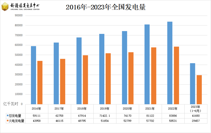 煤炭在中国能源消费中的主要形式是火力发电。国家统计局发布2023年上半年能源生产情况,其中显示,电力生产保持增长。上半年,发电量41680亿千瓦时,同比增长3.8%。分品种看,火电同比增长7.5%,水电下降22.9%,核电增长6.5%,风电增长16.0%,太阳能发电增长7.4%。6月份,发电量7399亿千瓦时,同比增长2.8%。