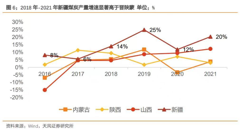 我国晋陕蒙新四省原煤产量不断增长,中东部地区原煤产量持续衰减,我国煤炭生产逐步向西北部集中,在2018年以来,新疆在晋陕蒙新四个省份中,产量增速一直维持最高。