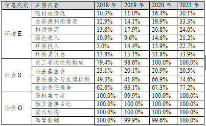 近年来,上市公司在环境、社会责任和公司治理三个领域的细分指标中的信息披露完整性和积极性不断提升。以成份公司为例,环境(E)类信息披露近年来有一定改善,并在2021年有较大程度提升,主要表现为加强了碳排放、用水情况等信息的披露;社会(S)类信息披露情况近年来有较大改善,部分内容已逐渐成为披露“必答题”,如员工学历性别构成等指标;治理(G)类信息的披露覆盖情况最好且较为稳定,多数指标来源于年报,为强制披露。