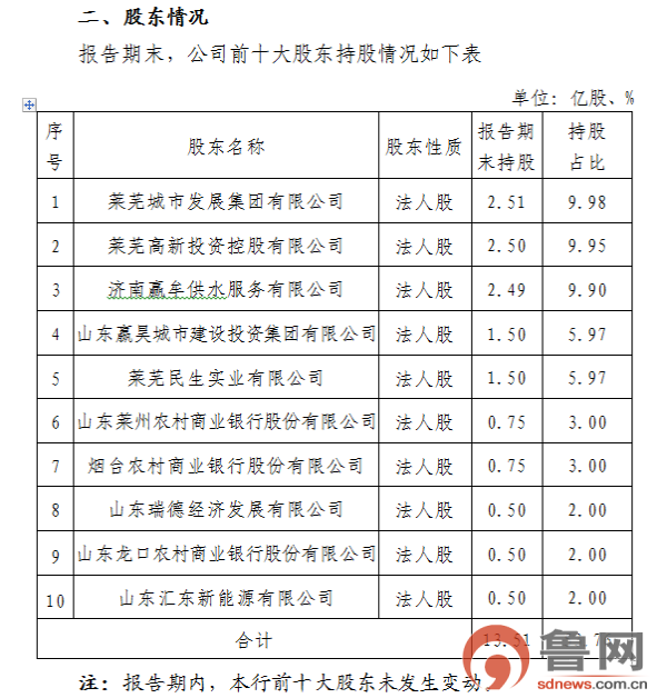 截至2021年6月末,本行主要股东共有10户,分别为莱芜城市发展集团有限公司、莱芜高新投资控股有限公司、济南赢牟供水服务有限公司、莱芜民生实业有限公司、山东嬴昊城市建设投资集团有限公司、山东瑞德经济发展有限公司、烟台农村商业银行股份有限公司、山东润邦经贸有限公司、李治国、吴修田。其中,莱芜高新投资控股有限公司、莱芜民生实业有限公司、山东瑞德经济发展有限公司等3户主要股东股权已质押。