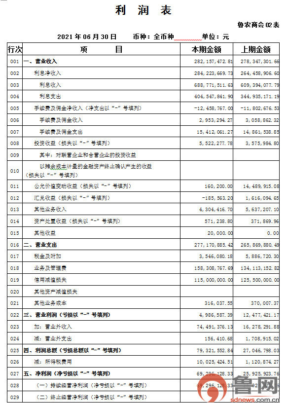截至2021年6月末,实现各项收入7.02亿元。其中,贷款利息收入4.61亿元,金融机构往来收入1.04亿元,手续费及佣金收入0.03亿元,金融投资实际利率利息收入及投资收益1.29亿元。各项支出6.97亿元。其中,利息支出3.76亿元,金融机构往来支出0.28亿元,手续费及佣金支出0.15亿元,业务及管理费1.58亿元,税金及附加0.04亿元,信用减值损失1.15亿元。