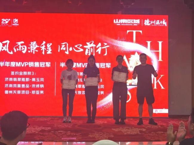 最后,区域营销总经理刘志伟总为区域签约金额前3名济南翡翠雅郡高玉风、济南凤凰壹品宋修炳、德州天宸项目郑亚男及签约套数前3(排除车储)德州翡翠首府徐萌、济南翡翠雅郡高玉风、德州天宸项目郑亚男人员颁发MVP上半年销售冠军奖项。