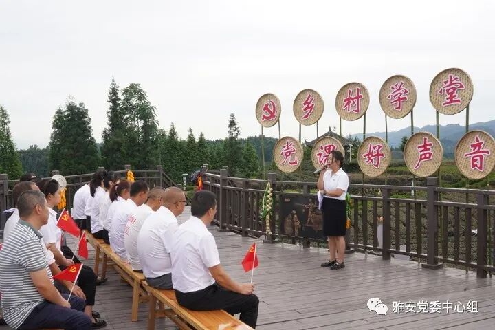 在雨城区草坝镇合江村“乡村学堂”,一堂茶园里的党课打通学习宣讲“最后一公里”不断创新教育培训载体。深挖红色资源,聚焦建设绿色发展示范市,探索建立“红色基因+绿色发展”党员实训体系,形成阵地、课程、培训、治学“四位一体”教育模式。试点创办“乡村学堂”,搭建农村党员群众教育新载体,让广大农村党员群众家门口就可学理论、强技能。先后开展“千名书记赛党课”“红色经典故事汇”“党员教育实景基地微党课暨讲解员大赛”“党课好声音”系列党课活动和“新时代雅州先锋”“雅安党员故事”典型宣传活动,引导广大党员坚定不移听党话、跟党走,让红色基因代代相传。