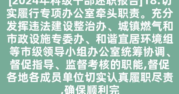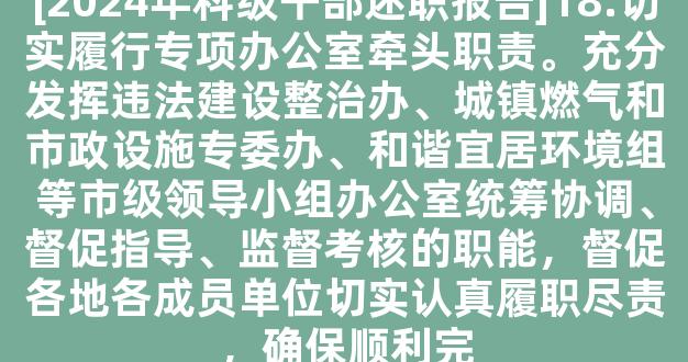 [2024年科级干部述职报告]18.切实履行专项办公室牵头职责。充分发挥违法建设整治办、城镇燃气和市政设施专委办、和谐宜居环境组等市级领导小组办公室统筹协调、督促指导、监督考核的职能,督促各地各成员单位切实认真履职尽责,确保顺利完参考范文如下: